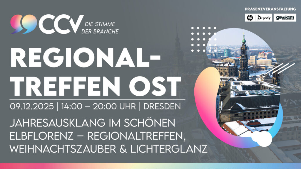Im Rahmen des Treffens finden Nachwahlen für die CCV-Regionalleitung Ost statt, da Martin Wittig zum Jahresende aus dem Amt scheidet. Tobias Heinrich, Head of Voice Solutions & Project Management bei der StröerX, kandidiert. Lesen Sie HIER mehr zu seinen Beweggründen und Vorhaben. Wenn auch Sie Interesse am Ehrenamt haben, wenden Sie sich gern an Jördis Harenkamp aus der CCV-Geschäftsstelle oder die weiterhin amtierende CCV-Regionalleiterin Ost Melanie Goldstein.